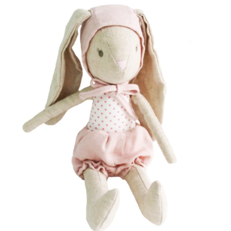 Gorgeous is our baby girl bunny in pink bonnet is a great friend to our baby boy bunny grey butterscotch . Pint sized bunny cuteness. Suitable from 18 months.