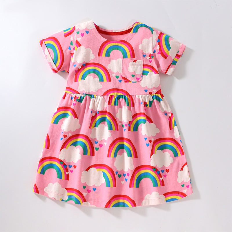 Delight your baby girl in this lovely Rainbow Graphic Short Sleeve Round Neck Dress. This tasteful dress features a vibrant rainbow graphic and a round neckline in a luxurious, lightweight fabric, perfect for casual summer days. Show off her unique style i
