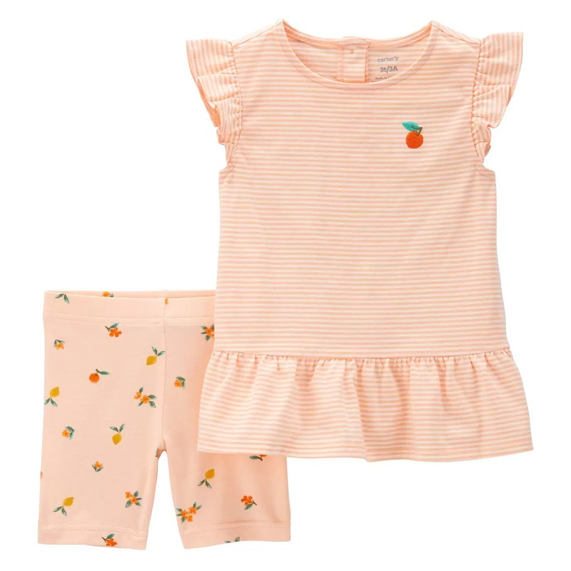 Made to match, this playful Baby Girls' 2-Piece Peach Flutter Top & Bike Short Set is complete with a flutter-sleeve top and a pair of stretchy bike shorts.Features:2-piece setFlutter sleevesPeplum hemBack snap placketCovered elastic waistband for a comfy