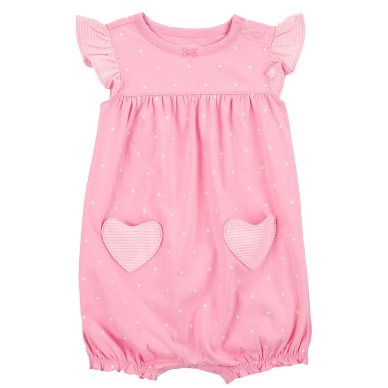 Adorably sweet, the Baby Girls' Pink Heart Cotton Romper 1S488210 features flutter sleeves, playful heart-shaped pockets, and a soft cotton jersey design. Its full snap closure ensures easy dressing while keeping her comfy and stylish all day.Features:Soft