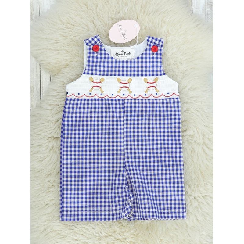 The cutest sibling set for your littles to go watch their older siblings play baseball in! We love the smocked baseball detail and adorable blue checks on this Johnny!