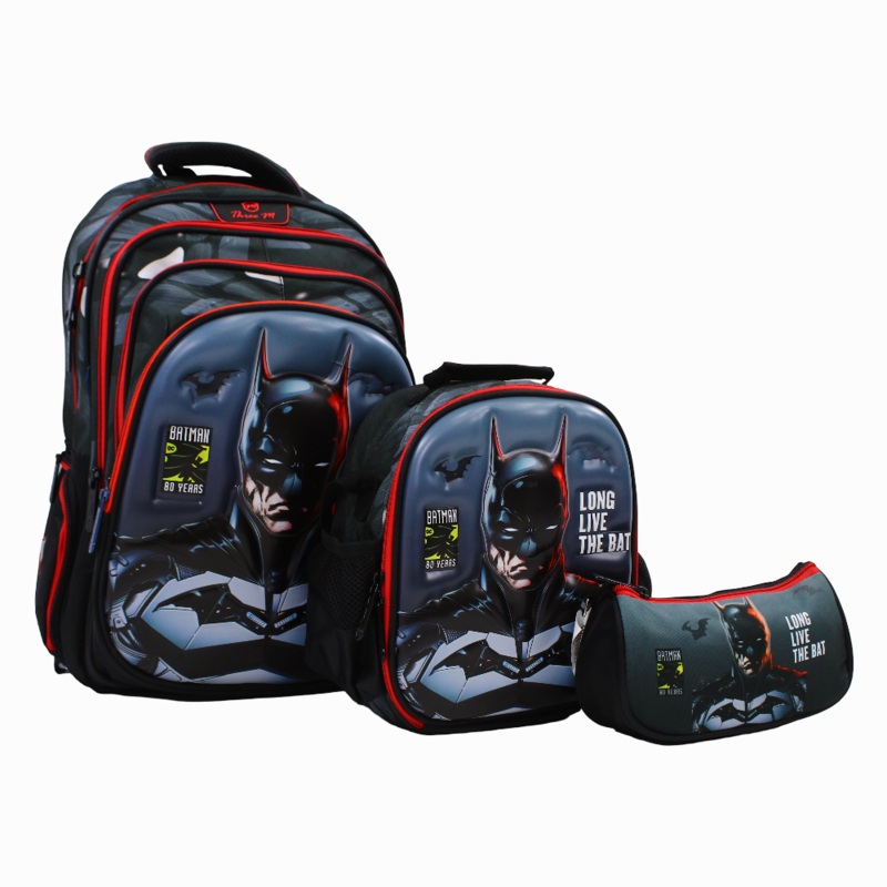 Perfectly practical with a touch of cool for every school routine. Supportive back and padded straps for all-day comfort Reinforced and water-resistant for lasting durability Matching lunch and pencil bags keep everything in place Grey Batman design adds a