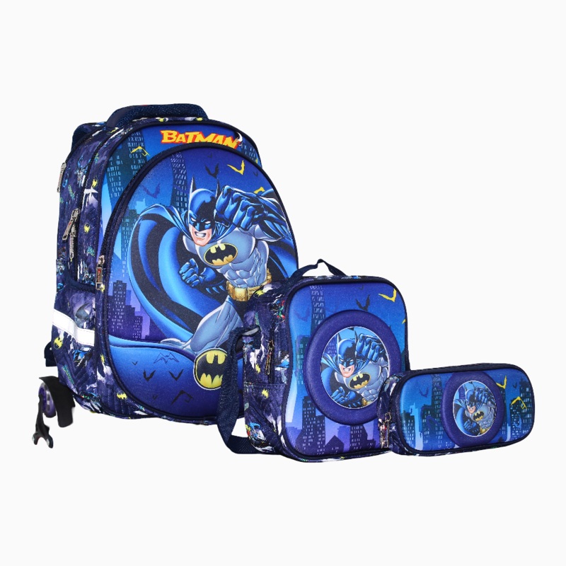 Batman Trolley Set All-In-One School Gear (Trolley Bag + Lunch Bag + Pencil Case).Get ahead this season with a ready-to-roll trolley bag thats both smart and stylish.Rolling wheels for effortless carryingSpacious compartments and coordinated accessoriesBui