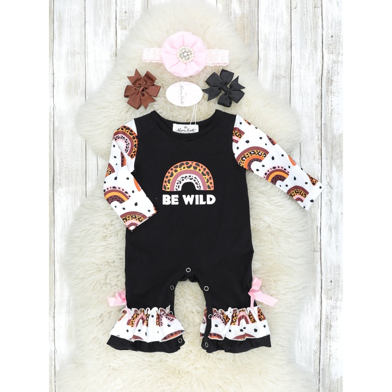 You've spotted the most lovableromperfor your wild child! This romper features rainbow detailed raglan sleeves, ruffles, bow details at the ankles, & a "Be Wild" cheetah print rainbow.Fits true to size.Snap buttons.50% Polyester / 50% CottonAccessories sol