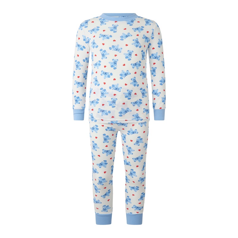 Treat your children to a night of comfort with the Bear Hearts Jersey Pajamas! Constructed with a soft jersey fabric, this sleepwear includes a festive blue and white teddy print. Its long sleeves and legs, plus elasticated cuffs and solid blue binding at