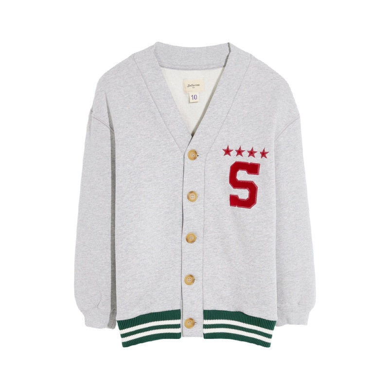 bellerosesandercardigan with a varsity-inspired style and made from a brushed cotton jersey. the relaxed cut is detailed with dropped shoulders, a deep V-neck, a front S in appliqu patch, and contrasting ribs on the bottom.