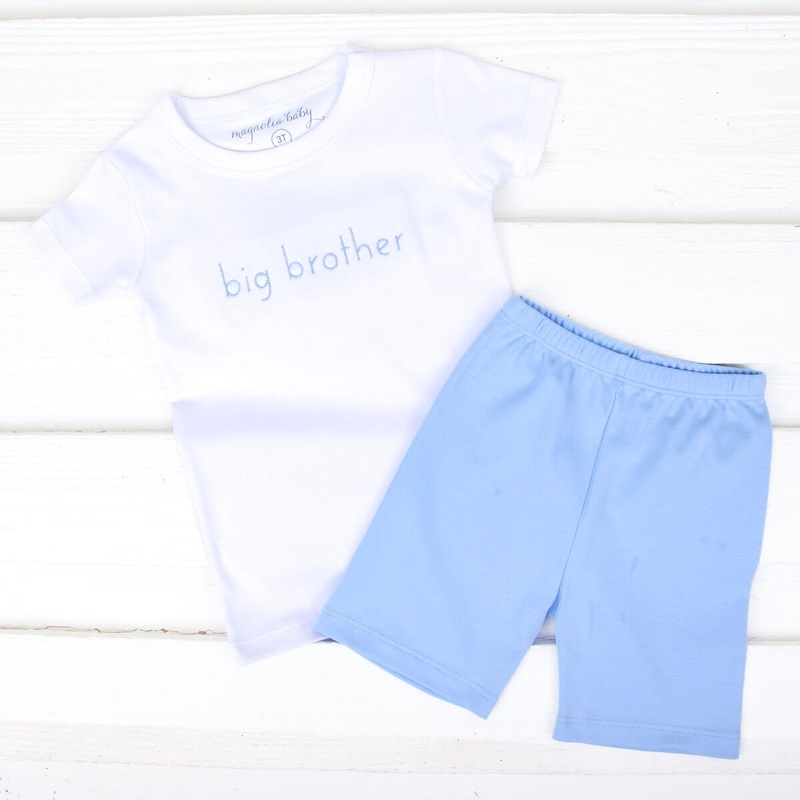 This set seamlessly complements other items in the Brother and Sister Collection and proudly showcases an embroidered "Big Brother" design. Made from 100% Pima Cotton in Peru, it guarantees comfort and quality. The white knit short sleeve pajama top pairs