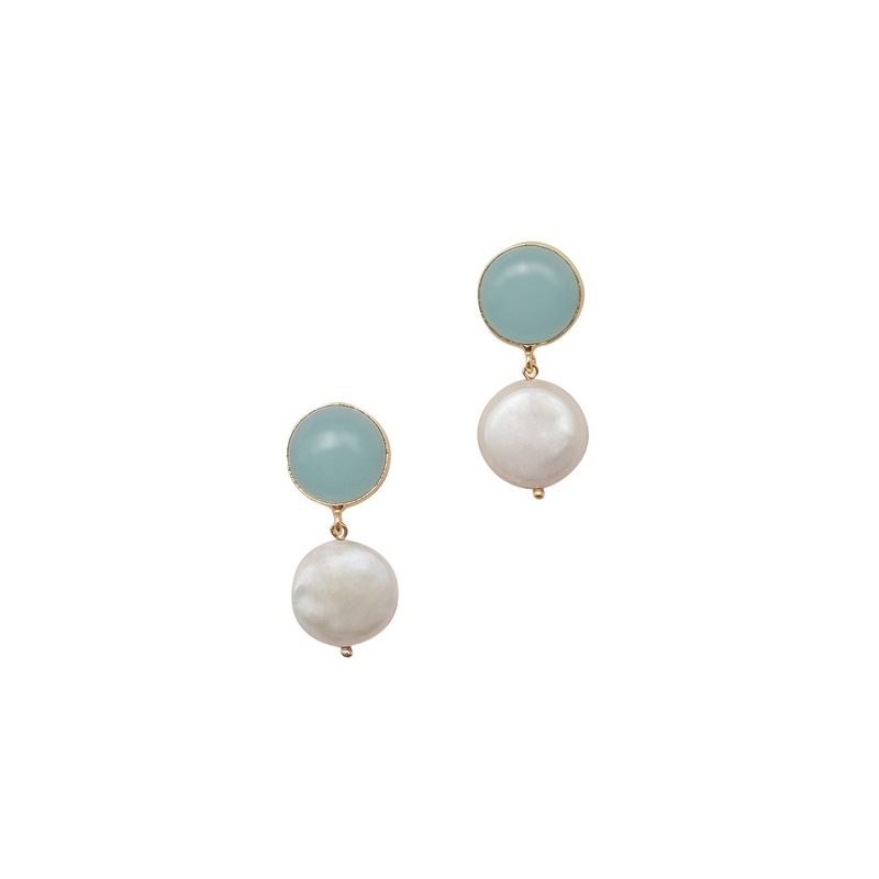 Blue chalcedony gemstones, freshwater pearl. Gold-plated post with butterfly closure. Handmade in Newport, Rhode Island. Due to the unique nature of genuine stones and freshwater pearls there will be slight variations from images on site.