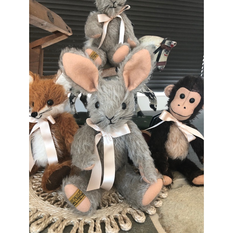 Lovingly handmade from sparse dove grey mohair, his slender ears, sweet expression and fluffy white mohair bobtail come together to create his endearing personality and he is sure to be admired.