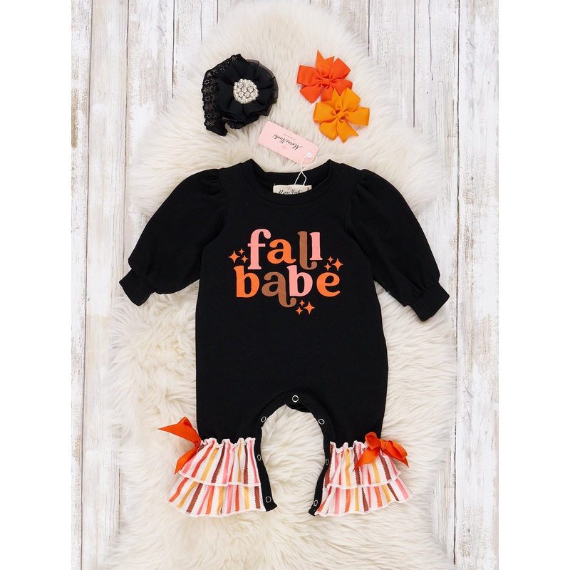 Your little babes will fall in love with this Fall Babe Sister Set! This adorable black romper features a fall sublimation design and ruffle details at the ankles.