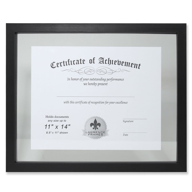 The Black Float Frame 530111 can be used for any document up to 11 x 14. This useful and attractive frame allows you to nicely display your important documents.11 x 14