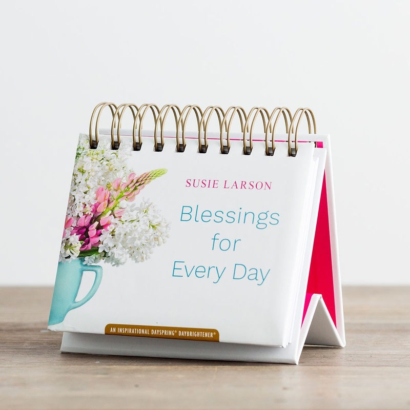 The Blessings for Every Day Perpetual Calendar Day Brightener 49911 is designed to give you a little inspiration everyday, with scripture verses and quotes. Beautiful cover, spiral binding, and a stand-alone easel display. Perfect for the desk top where yo