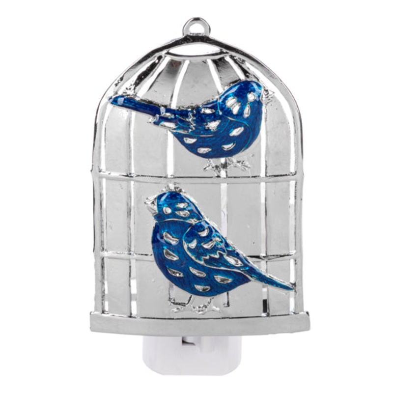 Shed some light in the darkness with this lovely Blue Birds in Birdcage Night Light. This pretty night light features a shiny silver birdcage and beautiful blue birds. It's perfect for children's bedrooms or guest bathrooms!Dimensions: 2.5"W x 2"D x 4.75"G