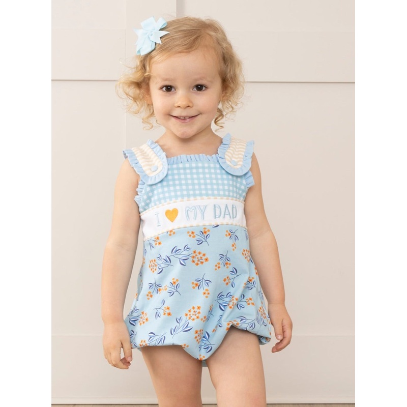 Show your daughter’s love for Dad with this playful Blue Floral Dad Love Ruffle Bubble! Featuring a charming embroidered “I My Dad” on the floral bodice and stylish striped button detail straps, this girls’ bubble is perfect for any occasion.