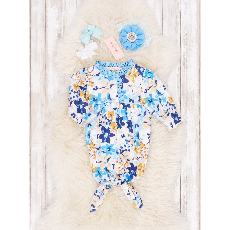 Are your girls going through the summer blues? Well, they will love this adorable and comfyBlue Floral & Gingham Sister Set! This gown features a playful pattern mix of polka dot and florals, plus playful ruffles that will flatter any fashionista. The bottom ties into a knot to keep baby snug for a day at the park or a backyard picnic!