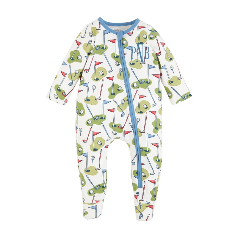 Let your baby eat, sleep, golf and repeat with our Blue Golf Sleeper. The cotton spandex footed sleeper features a white background. The sleeper features colorful images of golf accessories. The sleeper features blue piping details and a cross-body zipper for easy diaper changes.