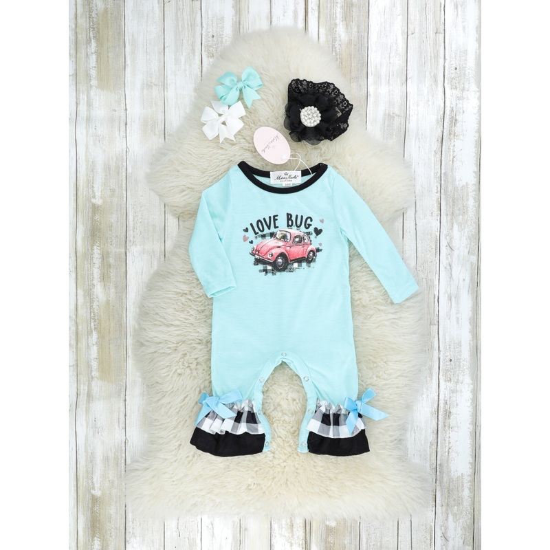 The cutestsister set for your little love bugs! This blue romper features a darling “Love Bug” detail, gingham ruffles, & bow details at the ankles.