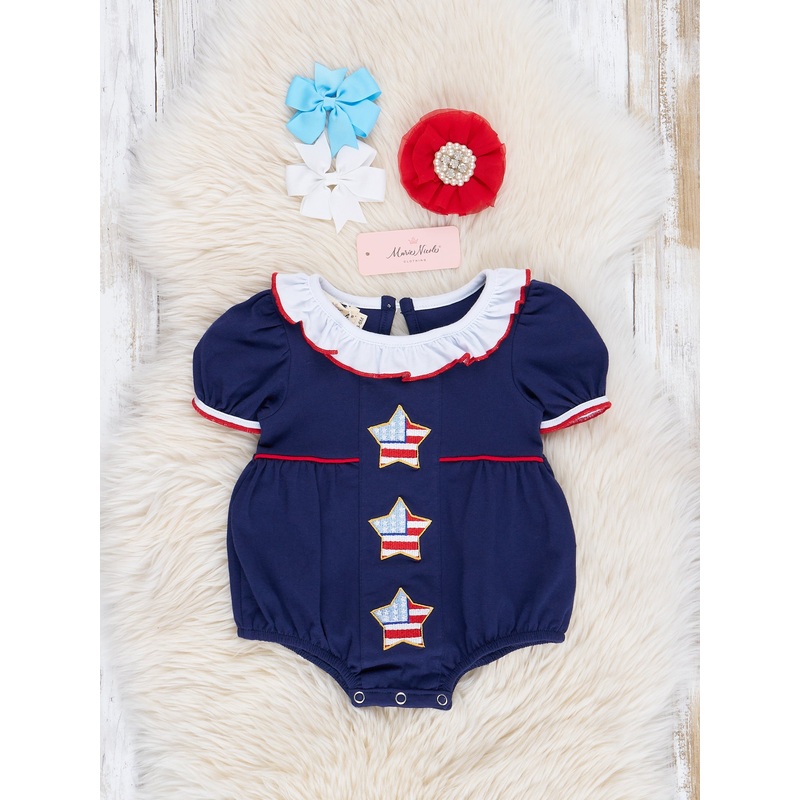 Get ready to show off your patriotic side with our Blue Patriotic Stars Ruffle Bubble! This adorable bubble features a playful ruffle peter pan collar and a deep navy color, making it perfect for any patriotic celebration! With 3 stars adorning the front,