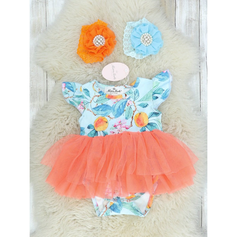 Oh my peaches! This sister set is TOO CUTE! We love the tulle!Fits true to size.95% Polyester, 5% Spandex.Snap buttons.Accessories sold separately.Add $6.99 for the headband.Import.Not sure what size to order? Check our size charts!Afterpay and Sezzle Purc