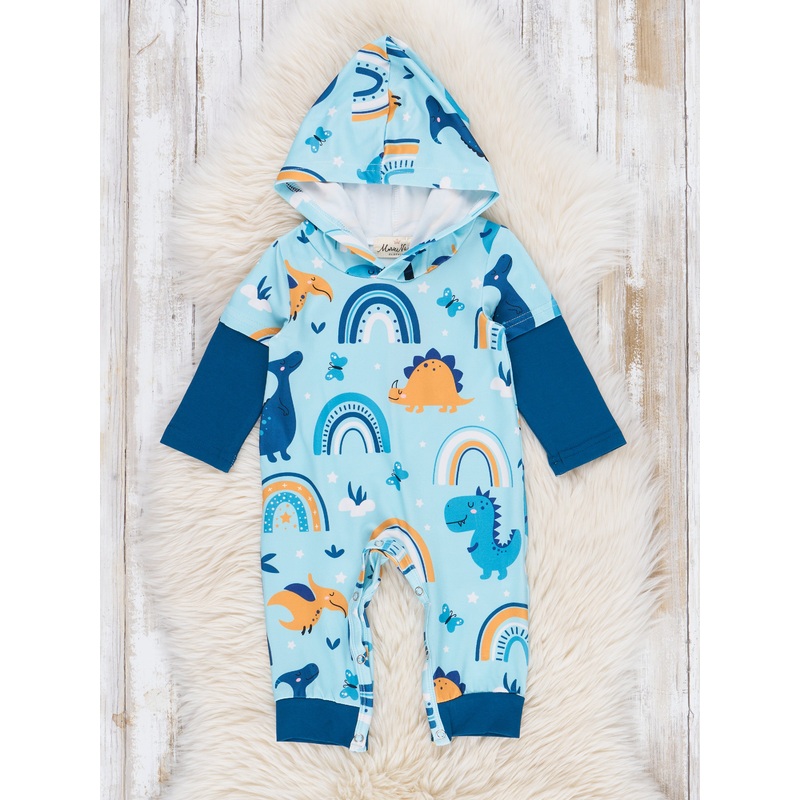Rain or shine, this boys romper has got your little one covered. With a playful and unique design featuring rainbows and dinosaurs, this hooded romper will make any kid stand out. The blue layered sleeves add an extra touch of coolness, making it the perfect piece for a brother set.
