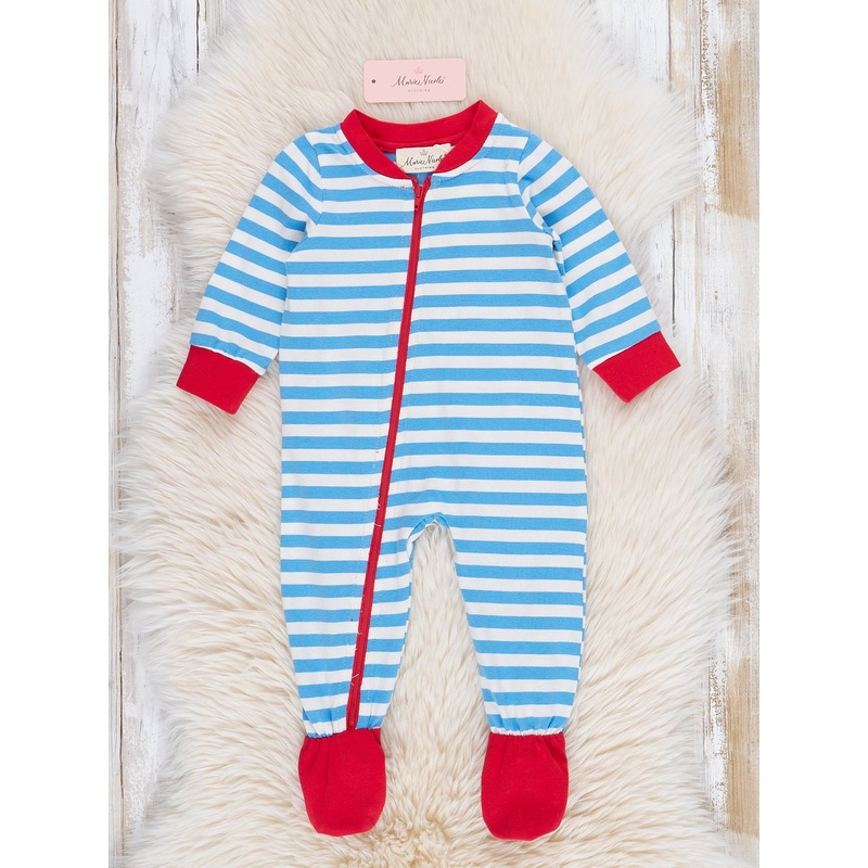 Get your little ones ready for the holiday season with this brother pajama set! These footed pajamas feature blue stripes and red trim, with an asymmetrical zipper for easy diaper changes. And the fun Santa cookies butt flap adds a playful touch to these C