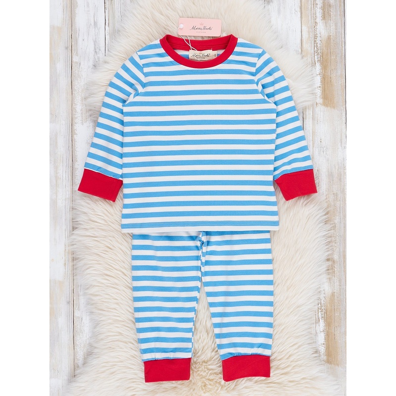Get your little ones ready for the holiday season with this brother pajama set! This pajama set features blue stripes and red trim. And the fun Santa cookies butt flap adds a playful touch to these Christmas pajamas. Perfect for keeping your little munchki
