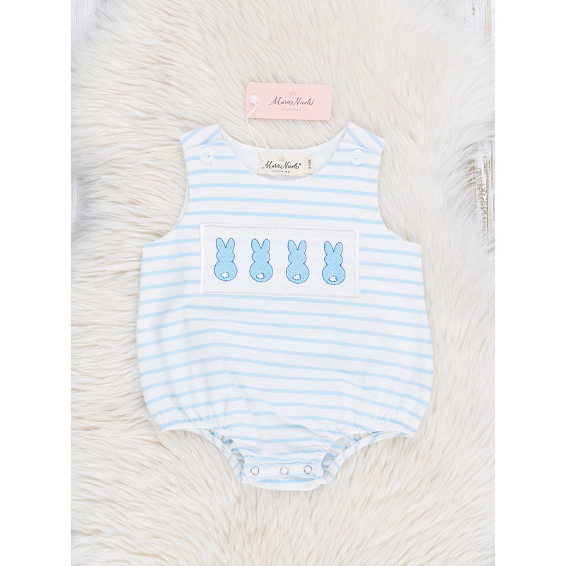 Hop into style with our Blue Striped Smocked Bunnies Bubble! Soft blue stripes and playful, embroidered bunny smocking make this piece perfect for any spring day. Pair it with our matching sibling setfor some extra bunny fun!