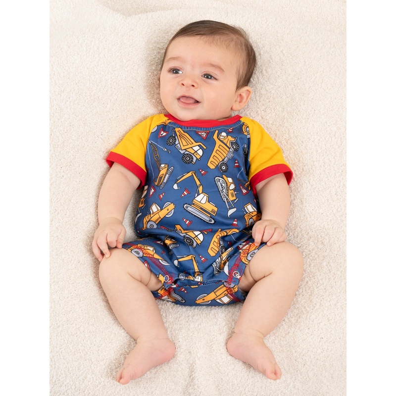 Get your little builder ready for playtime in this Blue & Yellow Construction Romper. The raglan sleeves and fun construction trucks print make this romper perfect for any adventure. Plus, there's a matching brother set for ultimate cuteness overload! Hard