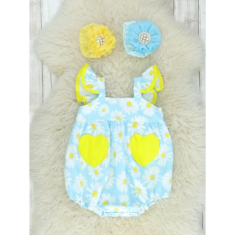 We this daisy bubble! This blue bubble features flutter sleeves with bright yellow trim, matching bright yellow heart-shaped pockets, a sweet daisy design, and snap buttons making for easy diaper changes!