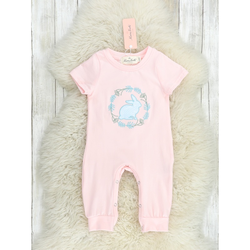 Adarling sibling setfor your dainty kiddos! This blushromperfeatures a bunny withleavesappliqu.