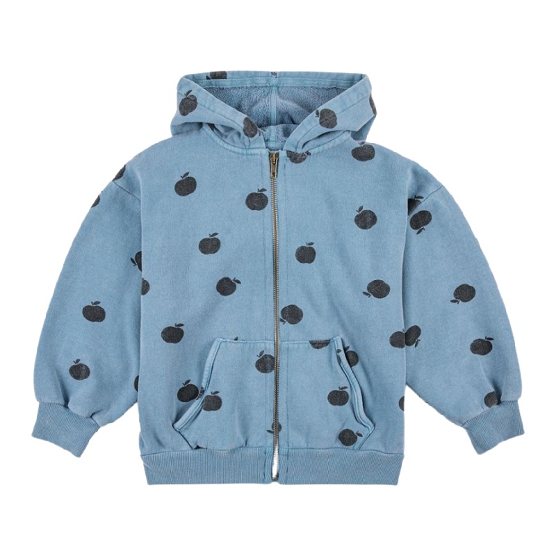 bobo choses blue poma all over sweatshirt, designed with long sleeves, dropped shoulder, front zip fastening, ribbed cuffs, embroidery, ribbed bottom and kangaroo pocket.67% organic cotton 33% recycled cottonmade in spainfinal sale