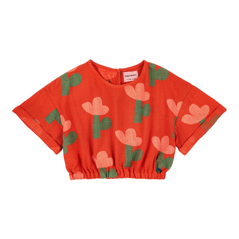 bobo choses sea flower all over woven short sleeve top red. made in a cropped style with gathered soft elasticated hemline andback button fastening.80% viscose 20% linenmade inspainfinal sale