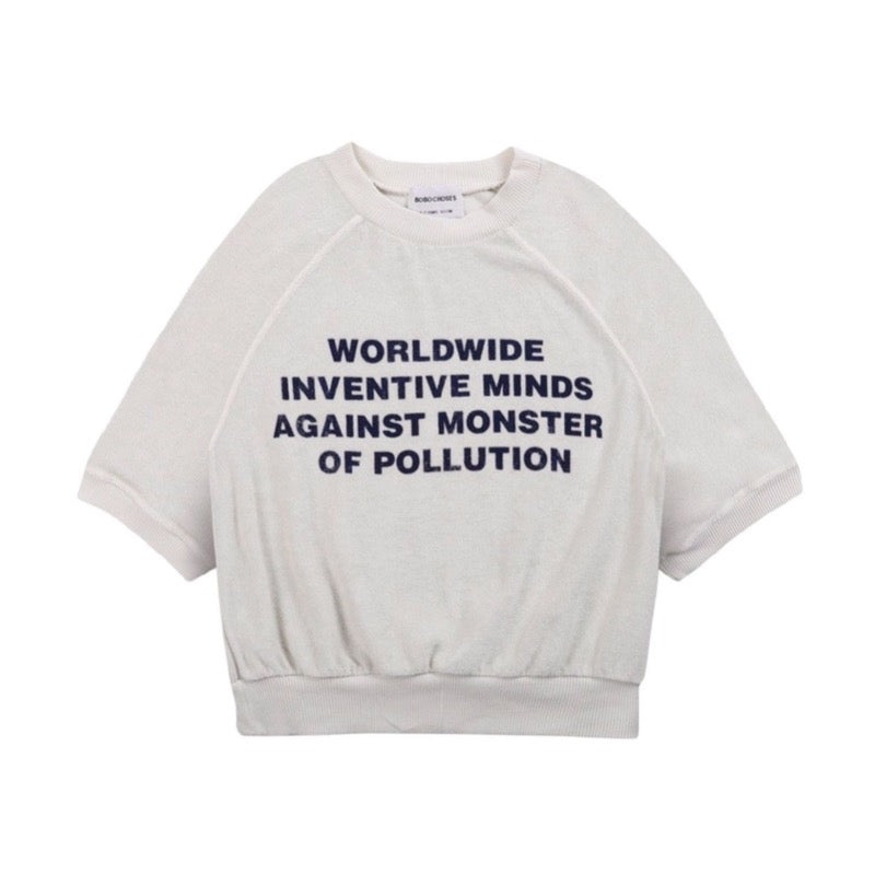 bobo chosesWIMAMP short sleeve terry sweatshirt features "worldwide inventive minds against monster of pollution" text on front and small red b.c. text on sleeve.100% organic cottonmade in spainfinal sale