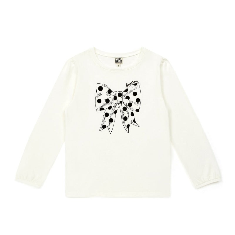 bontonclassic long sleeve crew neck tee in cream. features a polka dot bow graphic on front.