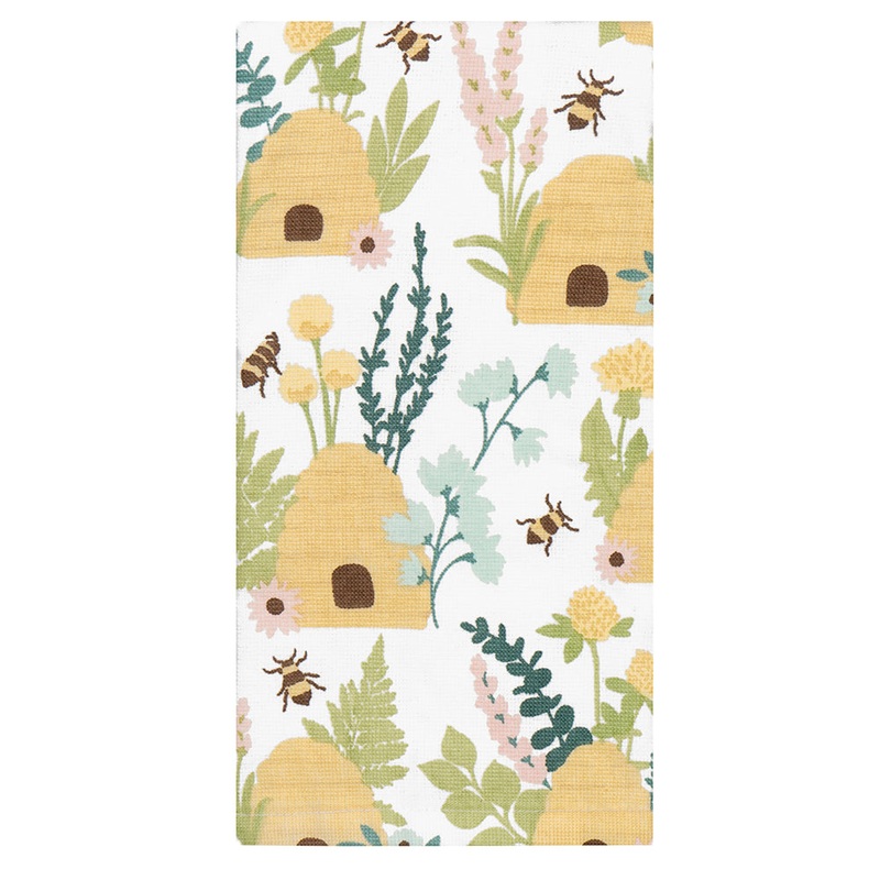 Brighten your kitchen decor with this bee-u-tiful Botanical Bee Hives Dual Kitchen Towel! It features an all-over print of beehives, bumble bees and pastel-colored flowers and greenery. On the other side is super absorbent terry cloth material.