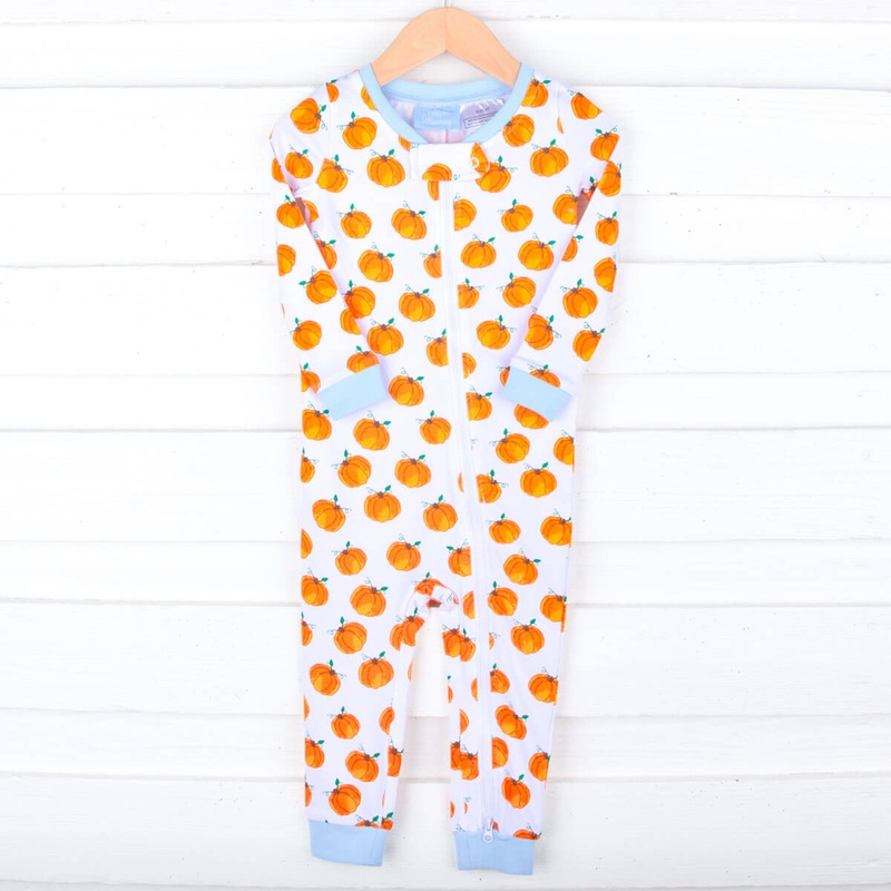 Find your cozy Fall look with our Bountiful Pumpkin Zip Sleeper. Made from a soft knit, these unisex pajamas feature an orange pumpkin print with light blue trim. For a coordinating sibling look, check out the pink trimmed version as well.This zip sleeper