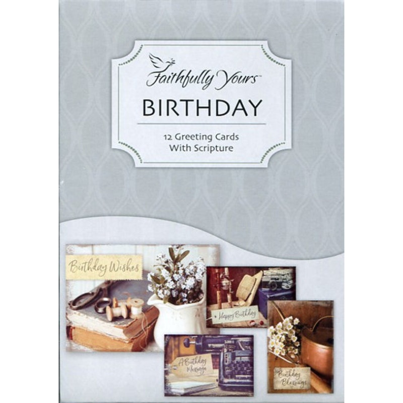 Wish somebody you love a happy birthday with these Boxed Cards Birthday Wonderfully Vintage 658-00304-000. Each card features a delightful image of vintage items with a birthday wish and a verse from Scripture.12 greetings cards with envelopes3 each of 4 d