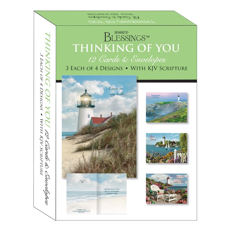 Use these Thinking of You cards to let a friend know you care about him or her.12 Thinking of You cards & 12 envelopes3 each of 4 designsKJV scripture verses inside every cardCard size is 4 3/4" x 6 1/2" (no extra stamps needed)Full-color inside