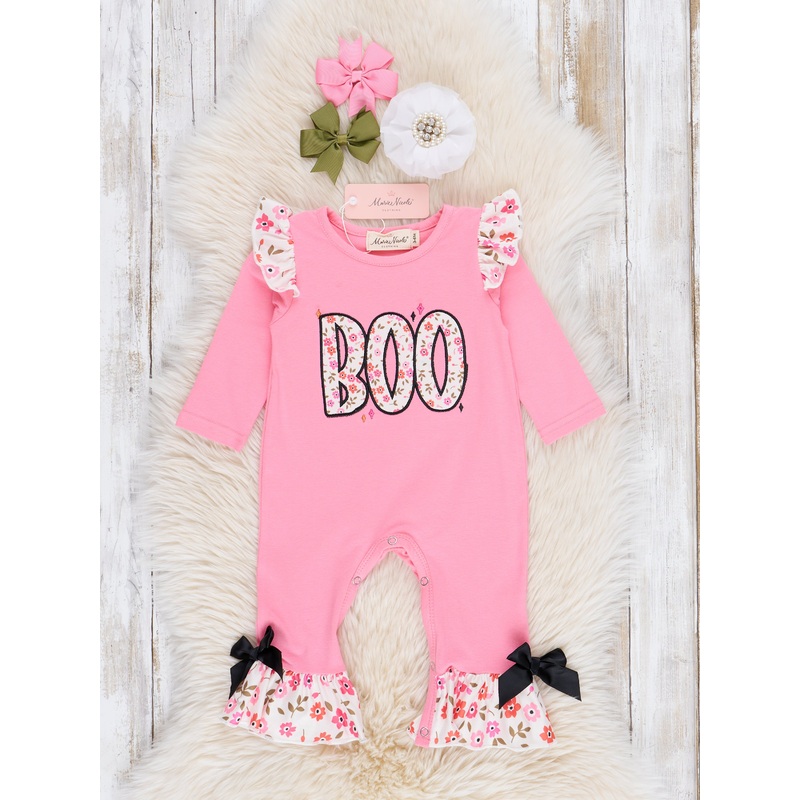 Spooky and sweet, this bright pink floral "Boo" ruffle romper is perfect for your little girl. With a coordinating sister set, it features a pink bodice, delicate floral ruffles, and an embroidered floral "BOO". Get ready to capture those adorable Hallowee