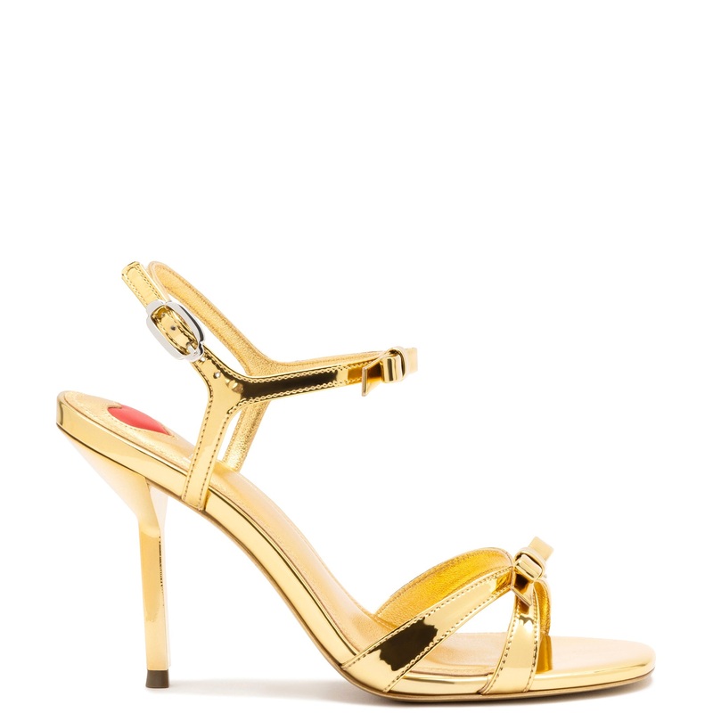 Metallic leather. Open round toe. Adjustable ankle strap. Bow detail. High heelInsole with memory foam cushion and hot stamp logo. Handmade in Brazil.
