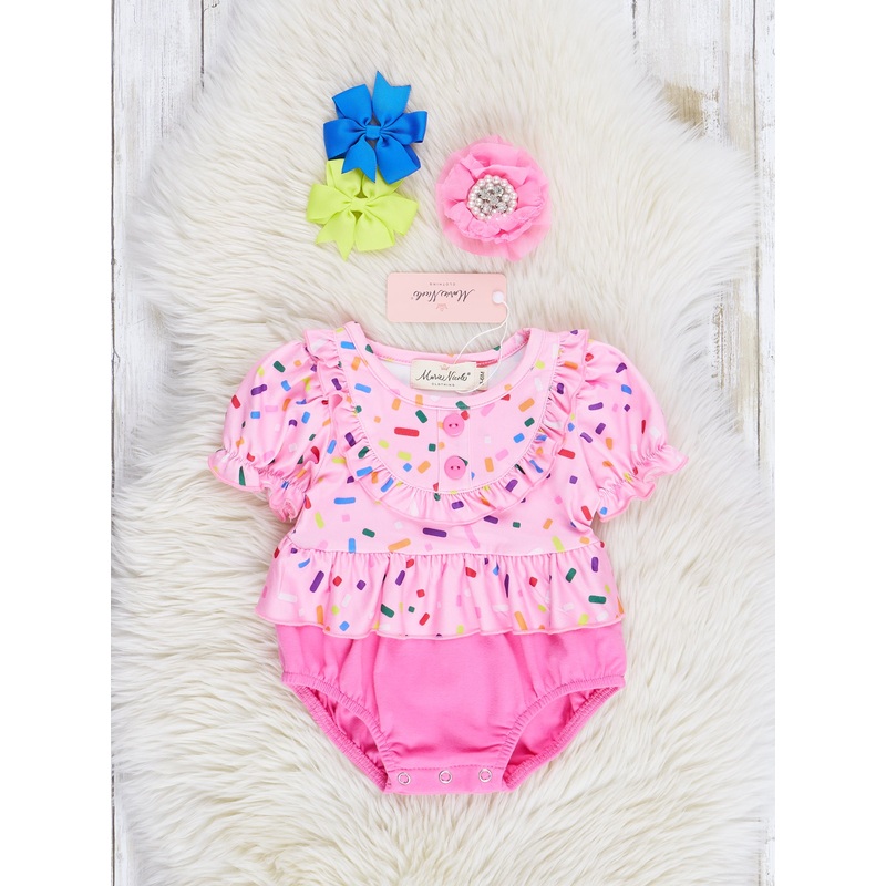 Satisfy your little one's sweet tooth with our Bubblegum Sprinklessister set!This adorable bubble is perfect for summer with its playful ruffles and colorful sprinkles. Get ready for some cute and fun in the sun!Snap buttons.Fits true to size.95% Polyester