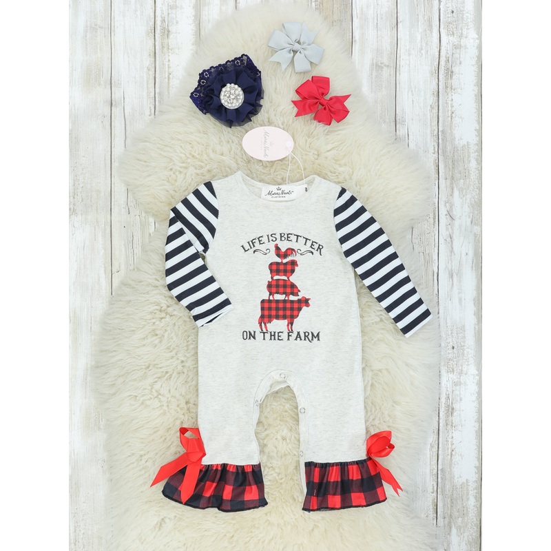 The cutest farmsister set for your sweeties! This romper features striped raglan long sleeves, buffalo plaid pant trim, & "Life Is Better On The Farm" vinyl animal decals.Fits true to size.95% Polyester / 5% SpandexSnap buttons.Accessories sold separately.