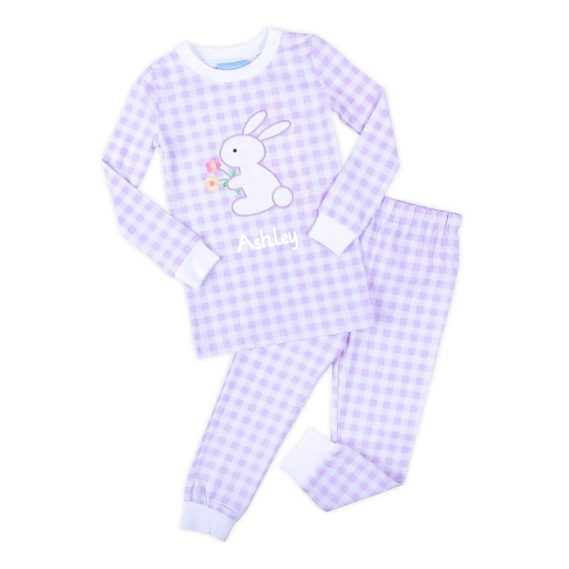 Get your little one ready for Easter bedtime with the sweetest Bunny Garden Lavender Check Pajamas. The lavender check pajama top features an adorable white bunny appliqu, paired with matching lavender check bottoms and white ribbed trim. These cozy pajamas are perfect for girls and can be personalized with a monogram for an extra special holiday touch.