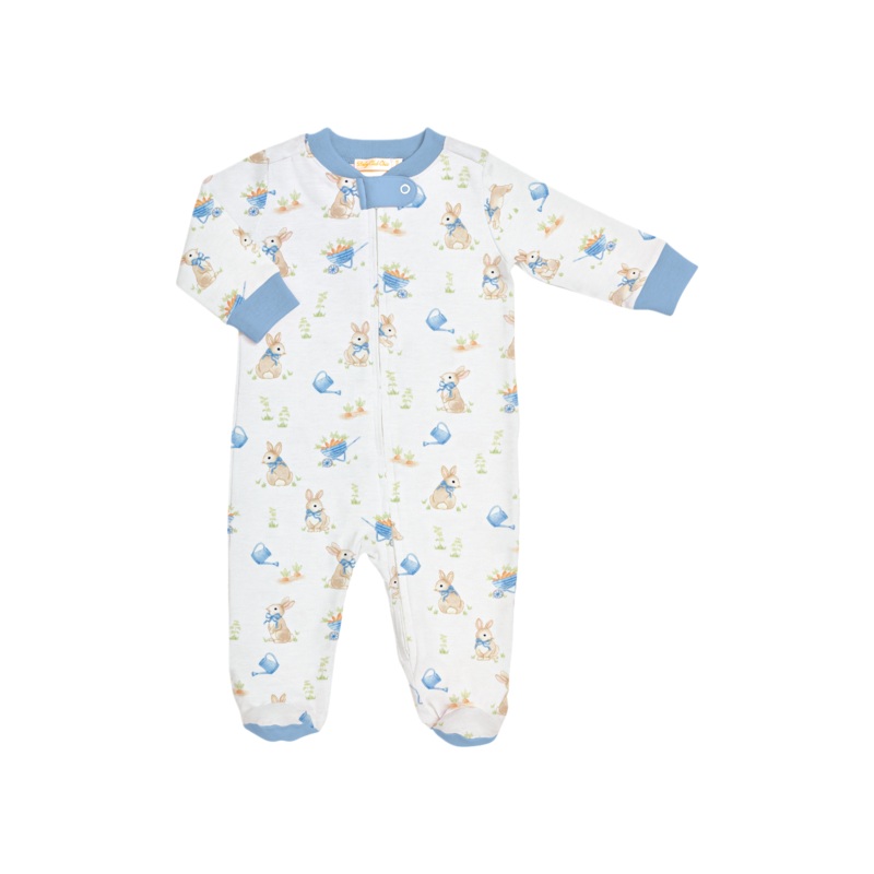 Bunny love. Made from supremely soft Pima cotton, this Bunny’s Garden Zipped Footie features a playful allover bunny print, contrast blue trim, and an asymmetrical zip closure for easy access.