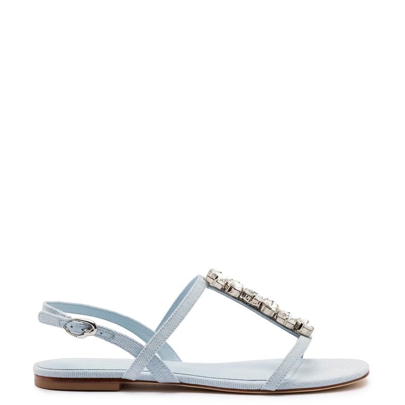 Denim fabric. Adjustable ankle strap.Silver hardware.0.4 inch heel.Stone embellishment.Finely crafted leather sole for support, durability, and comfort.Insole with memory foam cushion and hot stamp logo.Handmade in Brazil.