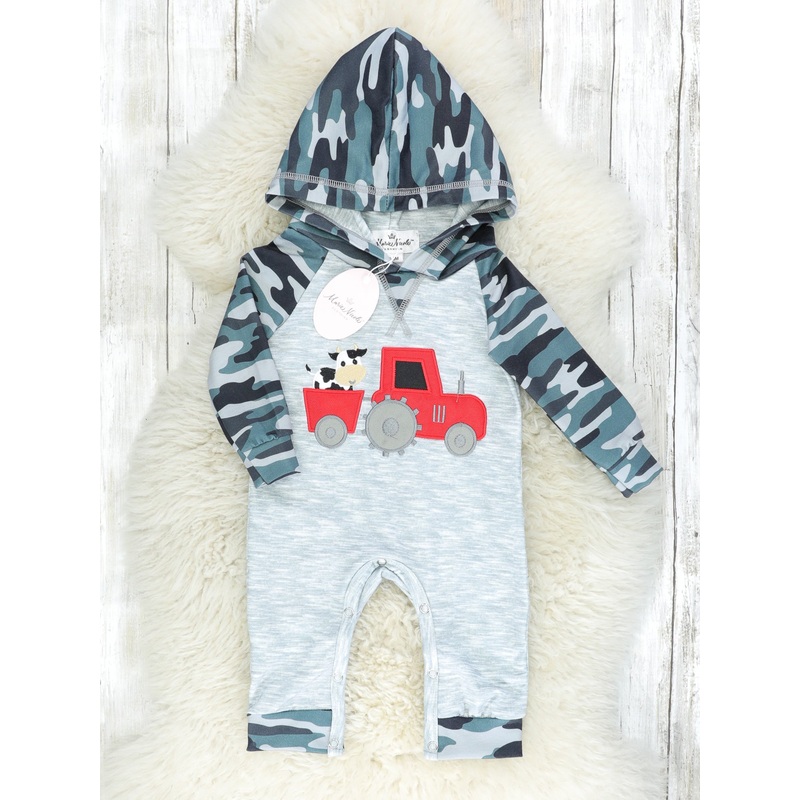 We almost didn’t see thisadorable camo set! This greyromper features camouflage raglan sleeves, a camo hood, & a cow riding a tractor appliqu.