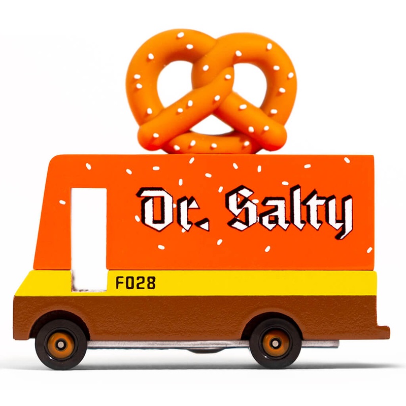 Youre knot going to be able to resist the new Dr. Salty Van. Trust us, were all twisted up over this one. The Dr. Salty Van wouldnt be right without a golden brown, salted pretzel topper.Materials & Info:Solid Beech Wood, water-based paint and clear uretha
