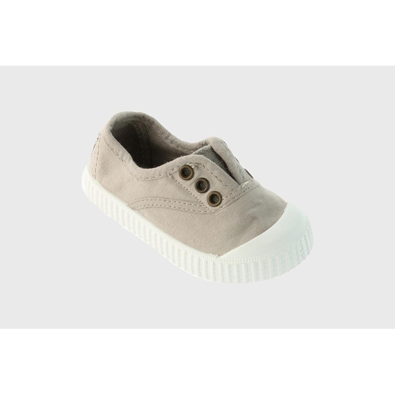 Victoria Oxford plimsolls, with white toecap and soft elasticated inner, without laces. Made of 100% organic cotton canvas, in stonewash, with rubber sole. TIP! We recommend you choose one size up from your usual size.The measurements in cm are for the ins