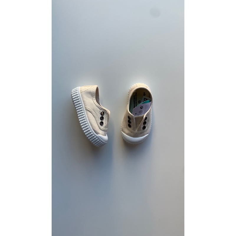 washed canvas shoes without laces for babies, girls and boys. with a cotton insole for greater comfort. tip! we recommend you choose one size up from your usual size.the measurements in cm are for the insole. exterior and lining 100% washed organic cotton grown in spain. rubber and cotton sole.