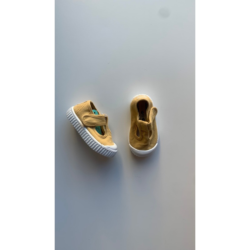 made of dyed 100% organic cotton canvas, with hook-and-loop strap fastening, and rubber toecap. available in a wide range of colours. tip! we recommend you choose one size up from your usual size.the measurements in cm are for the insole!100% cotton textil